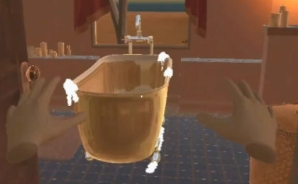 5、等到小忍进入浴缸后你就可以进去卫生间帮她洗头了,根据指示拍她的头完成沐浴,气泡计会随着你的互动进度增长。
