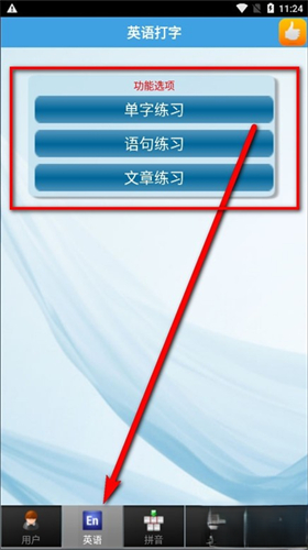 2、点击屏幕下方的英语按键,即可进入英语打字的练习界面,可以进行单字、语句、文章练习。