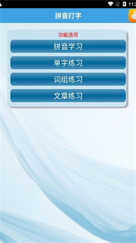 3、点击屏幕下方的拼音按键,即可进入拼音打字的练习界面,可以进行拼音、单字、词组、文章练习。