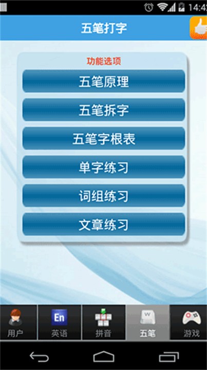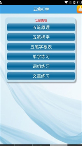 4、点击屏幕下方的五笔按键,即可进入五笔打字的练习界面,可以进行拼音、单字、词组、文章练习,也可以了解五笔原理,五笔拆字,五笔字根表。