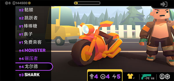 2、游戏中提供了多种类型的摩托车供玩家驾驶,而且不同的角色还拥有各自独特的技能供玩家选择。随着角色的升级,玩家可以在游戏开始时挑选心仪的技能,因此提升角色等级非常重要。