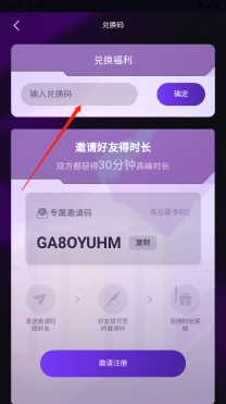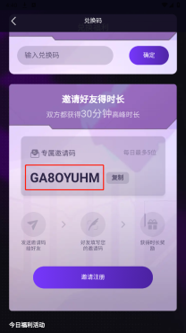 3、好友填写邀请码之后有一个兑换码,用户输入兑换码之后双方都可以获得30分钟高峰时长。