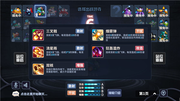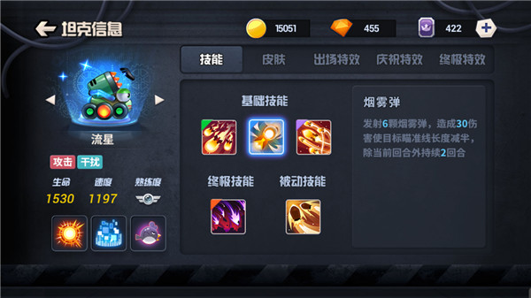 从技能上来看流星的技能多为重火力的输出技能,除去烟雾弹和被动技能外,其余全部技能均是伤害性技能,并且所有的技能均是多发型,这样技能搭配看起来就非常暴力,老铁们在使用这个坦克时如果能持续触发坦克的再次行动效果不仅会给敌人带来非常可观的伤害,同时也会有效地破坏敌方的地形,让敌人没有落脚之地。