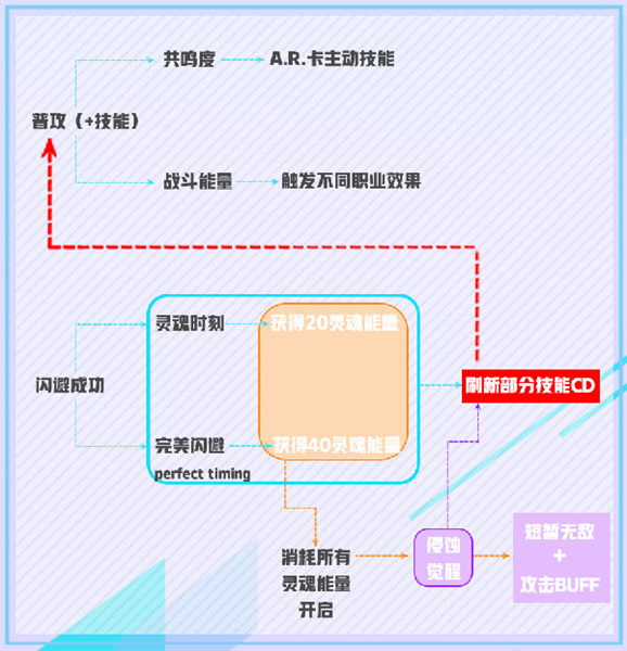 如果说A.R.卡更偏向于协助作战的话,那么对于灵魂行者来讲,开启“灵魂觉醒”状态才是作战中最为重要的部分。在遇到异生物BOSS有提示范围的攻击时,可以通过使用【闪避】来进行躲避,闪避成功则可以获得灵魂能量(普通闪避获得20灵魂能量,完美闪避获得40灵魂能量),当灵魂能量积攒完毕后手动点击图标则可以消耗所有灵魂能量进入觉醒状态,此时会获得短暂的无敌及超强的攻击BUFF,同时根据职业不同还会刷新部分技能CD。