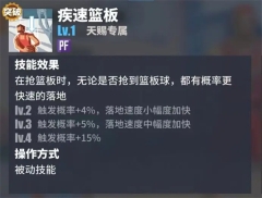 5、疾速篮板:在争夺篮板球时,不论是否成功抢到,都有可能更快地落地。Lv.2 时触发几率增加4%,落地速度略微加快;Lv.3 时触发几率增加5%,落地速度明显加快。作为一项被动技能,疾速篮板提高了天赐在篮板争夺后迅速回到地面的概率,无论是在进攻还是防守转换中,都能为球队赢得更多的时间优势。