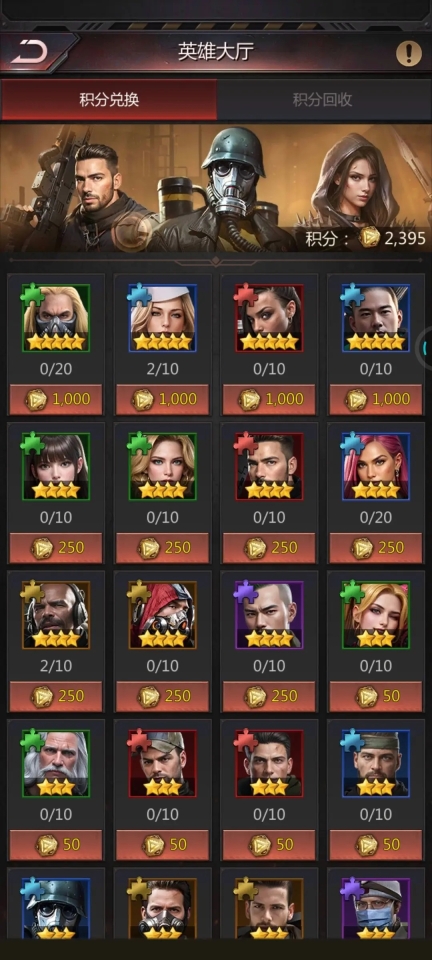 在英雄大厅的右下角有拼图碎片功能,进入后可以回收低级卡牌碎片以获得积分,之后可以用这些积分兑换其他卡牌碎片。