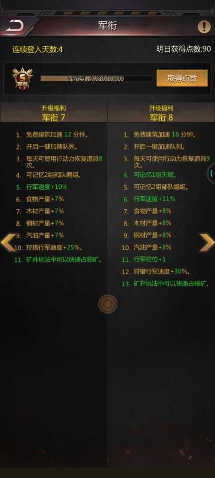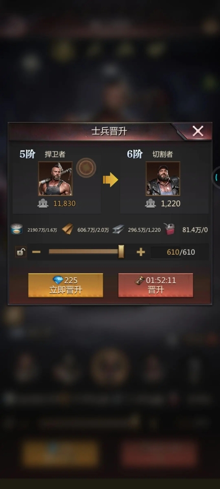 士兵升级玩法:只有营地16级才能才能升级低阶兵,占用训练时间和费用
