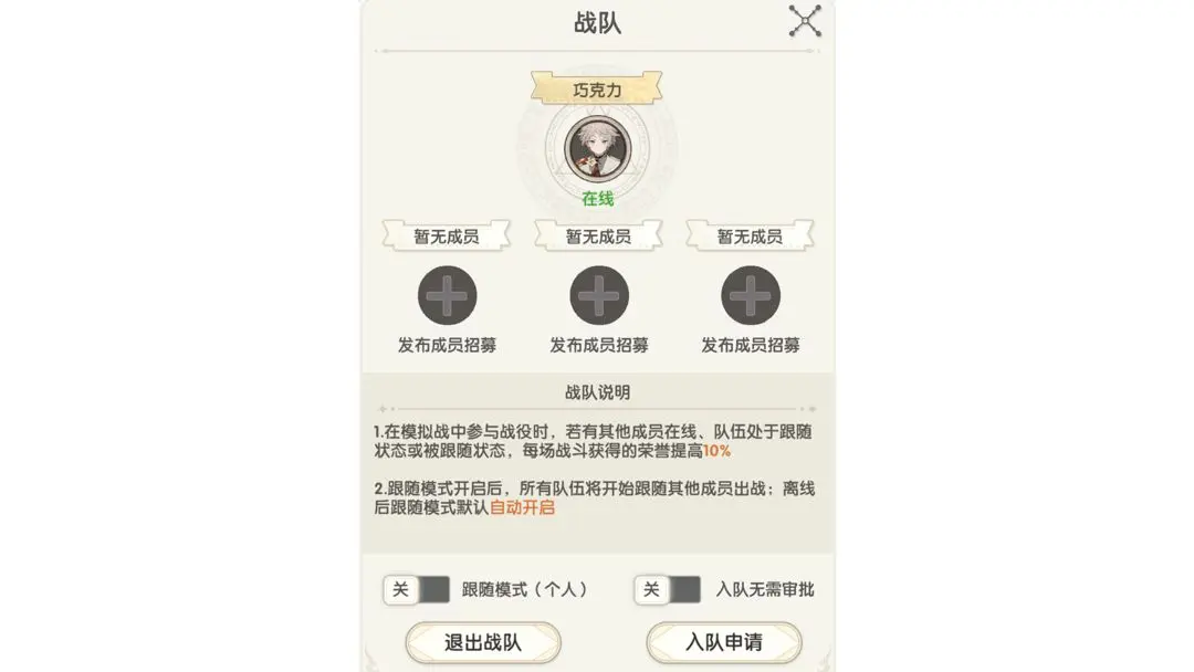 单独作战,指自己的队伍发起的进攻。自己最多可以安排3支队伍。队伍支持 [编队] 和 [解散]。