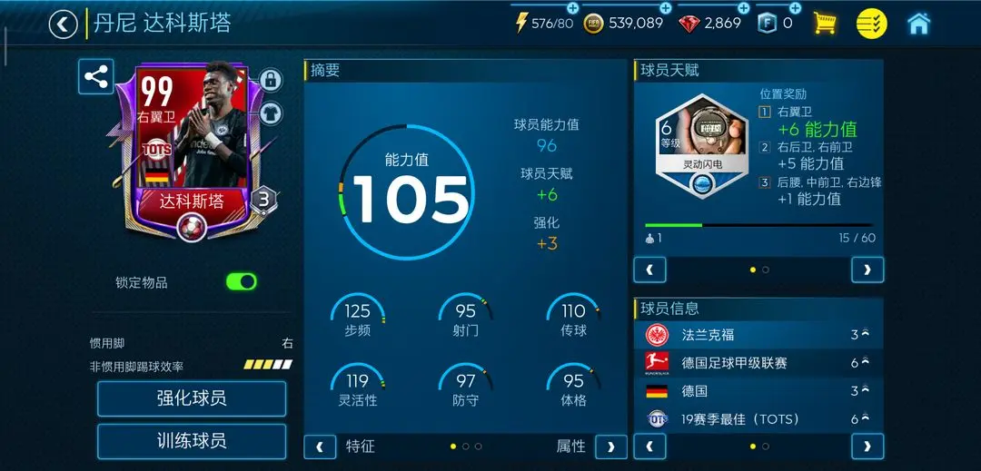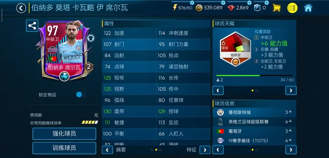 可以看到 传球117打门110 速度很快 短传长传都很高 视野也有130 远射也有114 很像上一期的tots迪巴拉