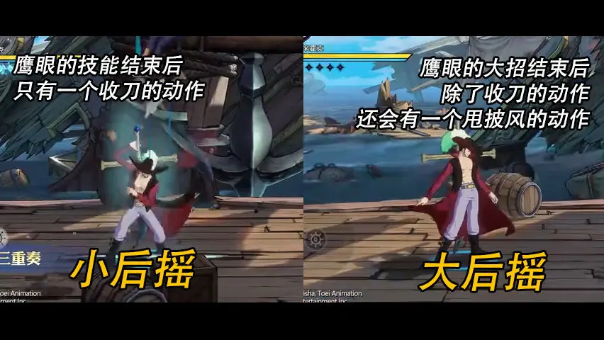 类似于前摇,索隆挥刀砍向敌人,造成伤害以后,一般会摆一个很帅的pose,然后又要从这个pose恢复到原来的姿势,这个过程一样属于“活靶子”时期,这一时期便被称为:“后摇”。