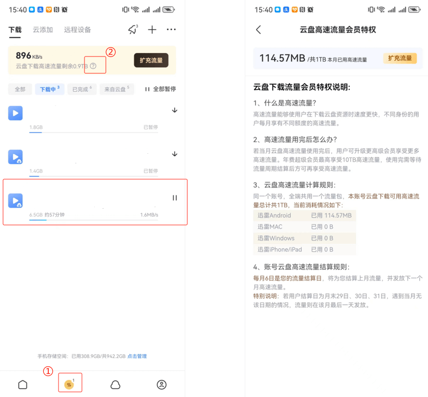 高速流量能够使用户在云盘资源时速度更快,不同身份的用户每月享有不同额度的高速流量