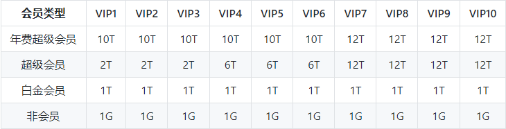3、不同会员身份对应的云盘空间如下: