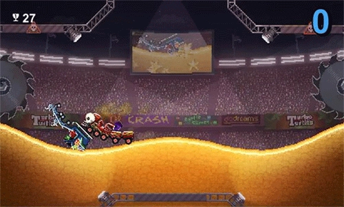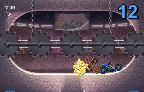 这个赛道和颠簸一样对车的性能要求较高,但与颠簸不同的是两边增加了大型旋转锯齿,所以更为更难做周旋。且这个赛道和更新之前仍做了一些变化,总的来说没什么特别大的影响,在开随机物品的情况下,体型不是很大的车压在两个炸弹上爆炸时可能会被炸飞到两个机械臂中间最终落到挡板上(如图)但这样做非常困难,我试了几十次也未能停在上面,只见过敌车这样过。这也并不会刷多少分,因为倒计时结束后会有大量陨石砸在上面很难幸免于难。说到车辆,重心不稳的车依然难以在这个赛道立足,车辆也需要能够进退自如,生死一般只在几秒之间。不推荐鬼火车,因为一旦冲过头想后退简直困难。
