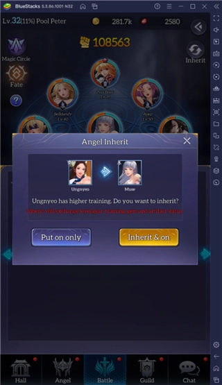 空闲天使具备一项继承特性,于阵容里若以较弱的天使取代较强的天使,那么较强天使的属性与升级情况会转移至较弱的天使身上。你有权选择拒绝继承,使较弱天使维持原有属性。