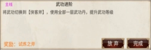1. 后续依照主线任务推进,当进行到特定任务时,无需手动操作,任务会自动完成。这里要注意,千万不要把武功丹用于侠客系列的武功。因为侠客武功在线练功本身就自带双倍经验,若用武功丹喂给侠客武功,并不会额外获得双倍经验。武功丹可以用在闪光斧上。