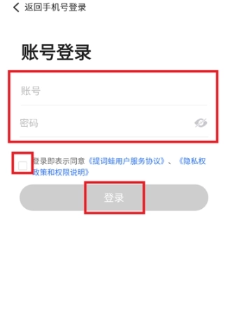 4、填写账号、密码,勾选“登录即表示同意《提词蛙用户服务协议》《隐私权政策和权限说明》”,然后点击“登录”即可。