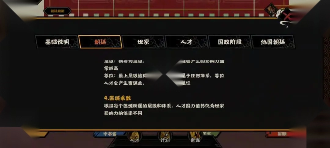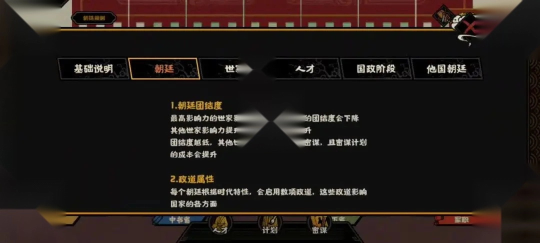 相对而言较为简单,奉行踩高捧低原则即可。面对第一世家,着重针对他们那些高才高位者,进行各类打压。其中性价比最高的方式,是采用低消耗的构陷、弹劾以及刺杀手段。即便自家影响力已然位居第一,也绝不能心慈手软,一切以完成任务为重(注意尊位不要轻易去动,每个回合仅有3点密谋点)