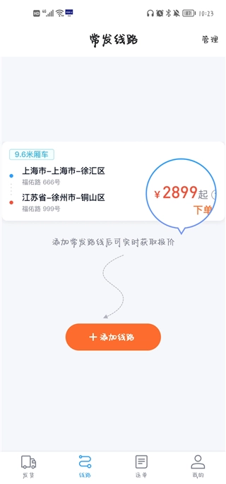 6、点击进入路线,用户可以添加自己常用路线,这样就可以获取实时报价啦。