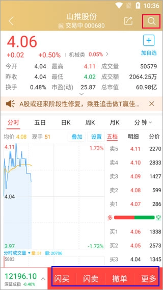 4、点击右上角的搜索按纽,输入你的股票代码,可以查看自选股票行情;用户还可以闪买、闪卖,撤单等操作;