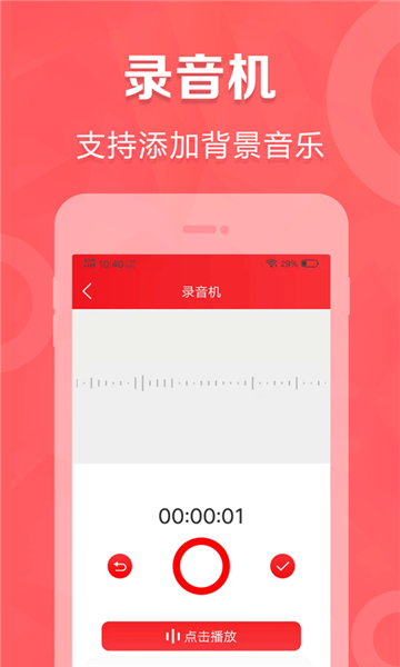 4、录音机:手机录制音频,录音后可任意添加背景音乐,原汁原味配音才更加真实;