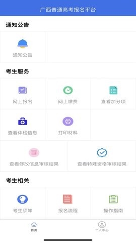 考生服务涵盖:网上报名、网上缴费、加分项查看、体检信息查看、材料打印、信息审核结果的查看与修改、特殊资格审核结果查看。