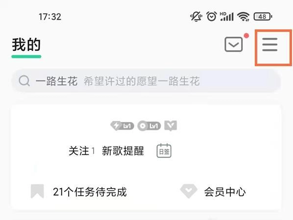 1、打开,在我的音乐点击右上角三横线进入更多页面。