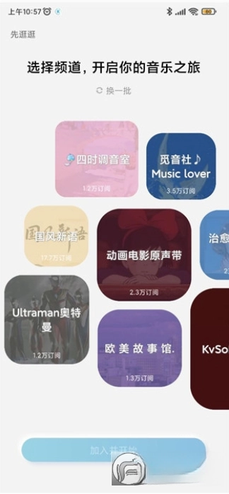 1、在本站并安装酷狗免登录版,选择喜欢的频道,点击加入并开始