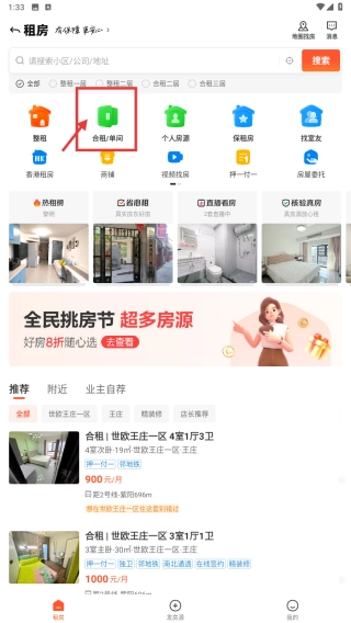 2、在租房功能页面,选择合租·单间分类,浏览合租单间房源列表。