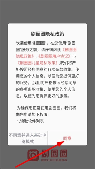 1、在剧圈圈隐私政策弹窗中,点击同意,进入首页。