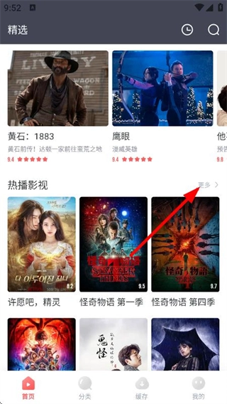 2、在首页,点击热播影视处的更多,进入全部分类页面。