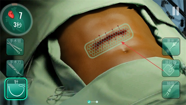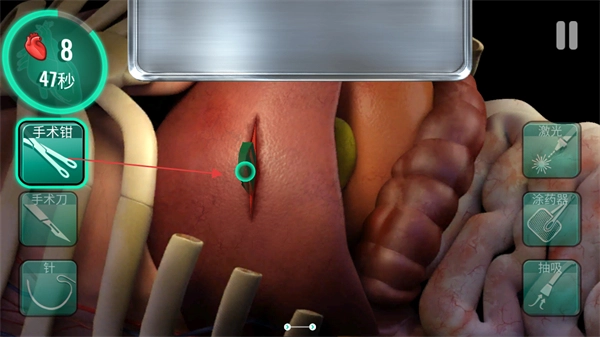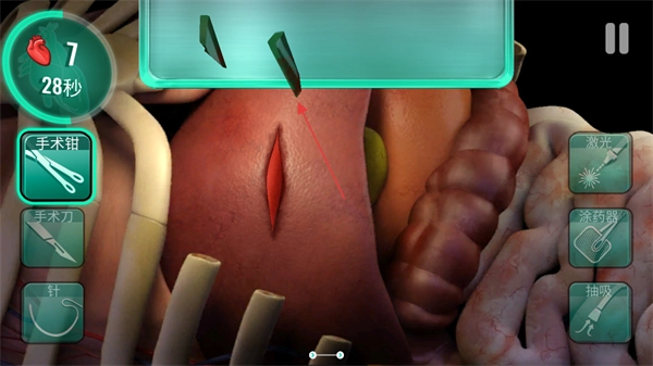 1. 踏入手术场景,关注屏幕左上角的剩余时间以及患者生命值,轻点左侧手术钳,把伤口处的异物取出来。