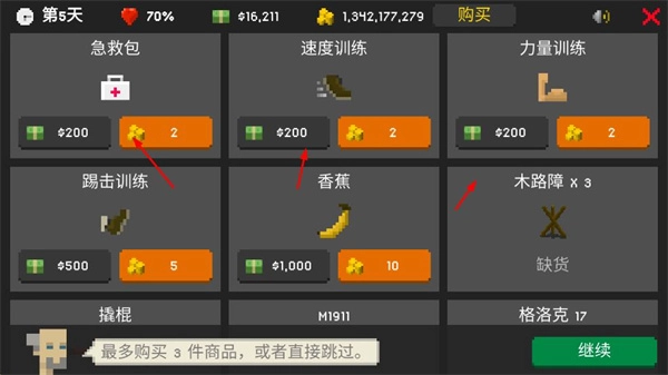 1、在商店购买急救包、速度训练、力量训练等道具,提升角色生存与战斗能力,为对抗僵尸奠定基础。