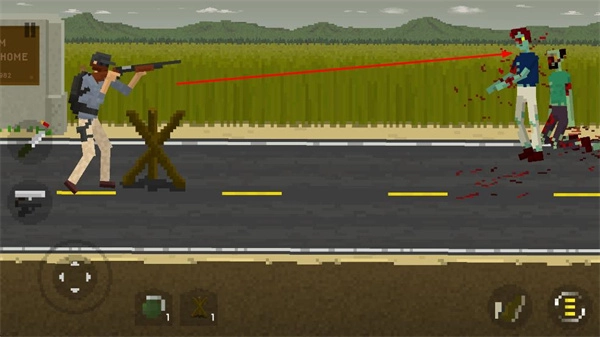 3、操控角色使用枪械射击僵尸,利用木路障等道具辅助防御,消灭僵尸推进游戏进程。