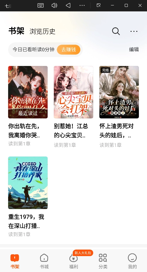 底部导航:可切换至【书架】、【福利】、【分类】等页面。