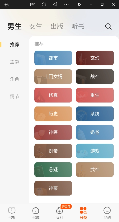 男生/女生/出版/听书:按读者群体或书籍形式分类。