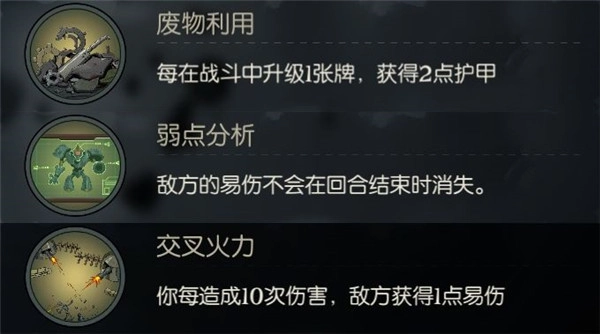 废物利用能帮助增殖流收获大量护甲。增殖弹有3级,复制的增殖弹为1级,增殖弹会越来越多,升级改造强化的范围也就越来越大,大幅度提升了防御力。弱点分析可以让易伤永久存在,易伤就会越叠越高,每回合对敌方造成的伤害也就越来越高。交叉火力能够配合弱点侦查机抽牌,没有弱点侦查机的时候选择该祝福收益会很低。