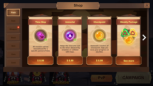 3. 装备升级:在商店中购买装备或收集地图中的宝箱和黄金宝石,用于强化属性或解锁新武器。