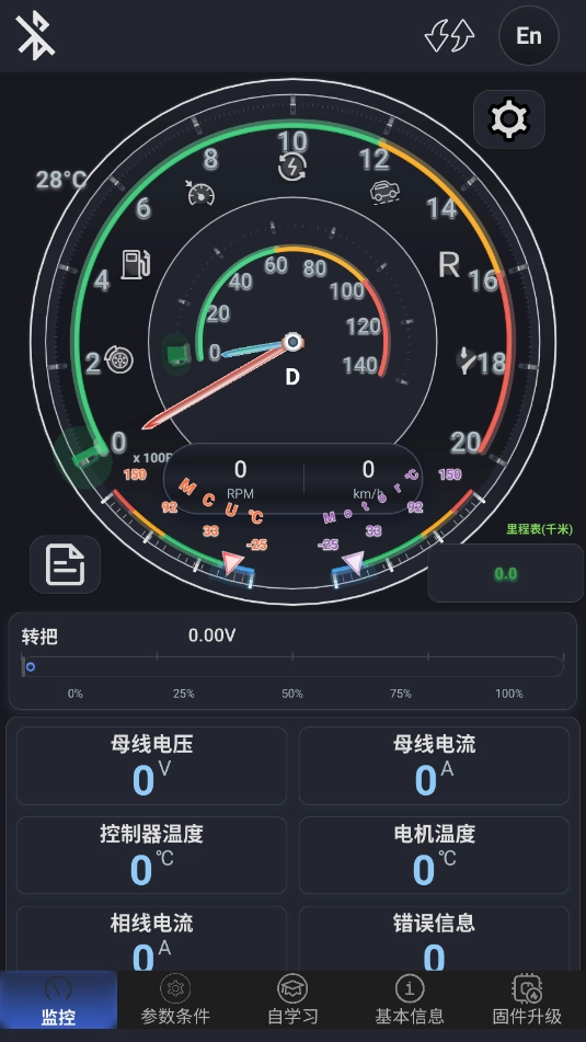 1. 借助蓝牙连接,对凌博控制器的静态参数展开调试,并实时监控凌博控制器的运行状态。同时,利用蓝牙实现对凌博控制器内部固件的远程ota操作。此外,还需记录使用该控制器的电动自行车的运行状态,以及调试过程中的电流、电压等相关参数。