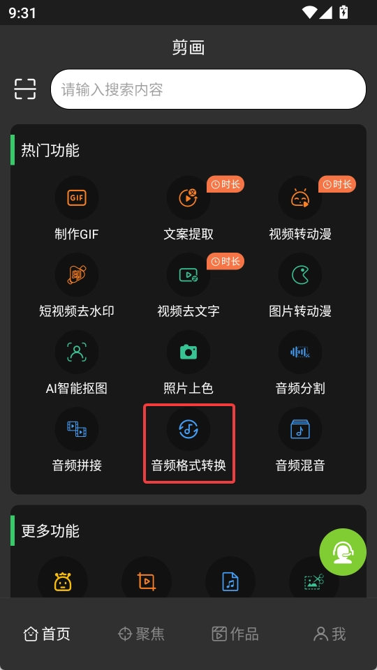 1、在首页找到音频格式转换功能,点击进入