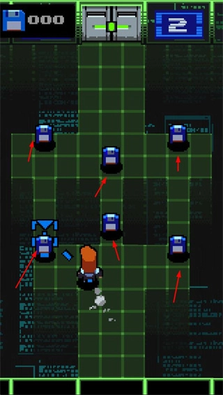 1、在网格地图中收集蓝色设备,获取资源或解锁新区域,同时躲避敌人。