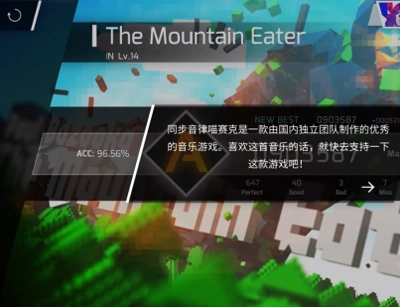 6、炫酷的谱面,优秀的音律,挑战「EZ」、「HD」、「IN」、[AT]四种不同难度的原创曲目。