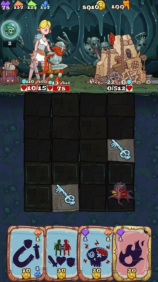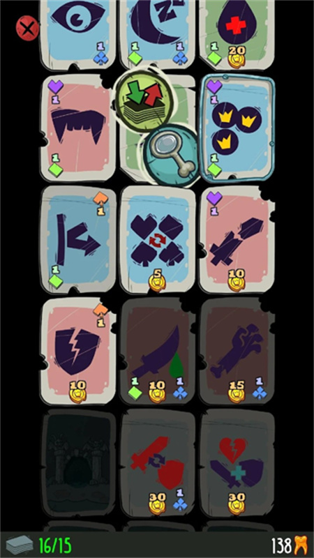 起初,我喜欢先清理完每个房间后再继续前进,原因其实很简单:每个房间通常只有一名守卫,其余大多是金币、药、剑、盾或者金牙,偶尔也会碰到卡牌、随从、蜘蛛网、毒气、炸弹、磁铁、黑洞,甚至魔镜(到了后期还会出现一些给守卫加Buff的奇怪道具),这样做看似风险较低。但渐渐地,我发觉这种方式性价比实在不高(主要是自己太懒,不想频繁点击),而且一旦翻到炸弹,瞬间就回到最初的状态(炸弹不仅会扣血,还会按比例降低攻击和防御),连我残血的佣兵也会因此阵亡(欲哭无泪)。到了游戏的中后期,负面卡牌频繁上手,符文也积攒不起来,手里握着卡牌却因条件不足无法使用,只能对着金币干着急。这款游戏在卡牌收集方面和《月圆之夜》有点类似,需要尽量维持卡包的纯度,才更有可能抽到自己想要的卡牌。毕竟我可没有像王样那样的好运气,能随手抽到强力卡牌呀hhh