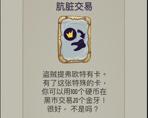 选择盗贼提弗欧,携带“肮脏交易”,借助主动技能,搭配“增值4”“卡牌换符文2”“身强力壮1”来刷取金币与符文。前期要仔细搜索房间的每一个区块(通过收集金币与“增值”配合),从理论上来说,资源足够每一轮把手牌过一遍(其中也包含负面卡牌,条件是手牌不会卡住发动条件),这就表示每个房间都能收获20金牙。一共有50个房间,那么总计可得:20×50 = 1000(这还没算上守卫掉落的部分)。