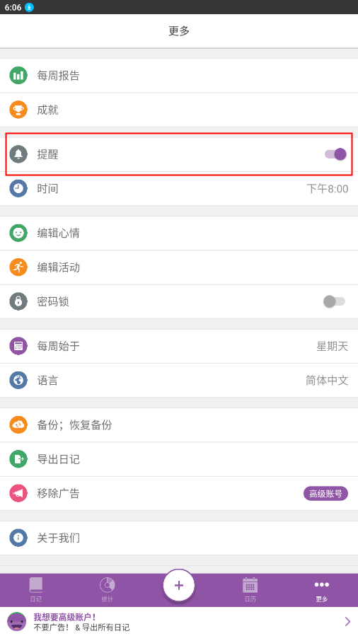 7、最后来到“更多”设置页面,打开“提醒”,这样就不会忘记写日记啦;
