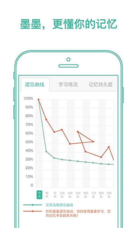 墨墨背单词基于 1200 多亿条用户记忆行为数据,结合你的每次记忆反馈,识别你的记忆持久度,分析你的遗忘曲线,精准定位你对每个单词的遗忘临界点,动态调整复习规划,帮你高效规划海量词汇记忆。