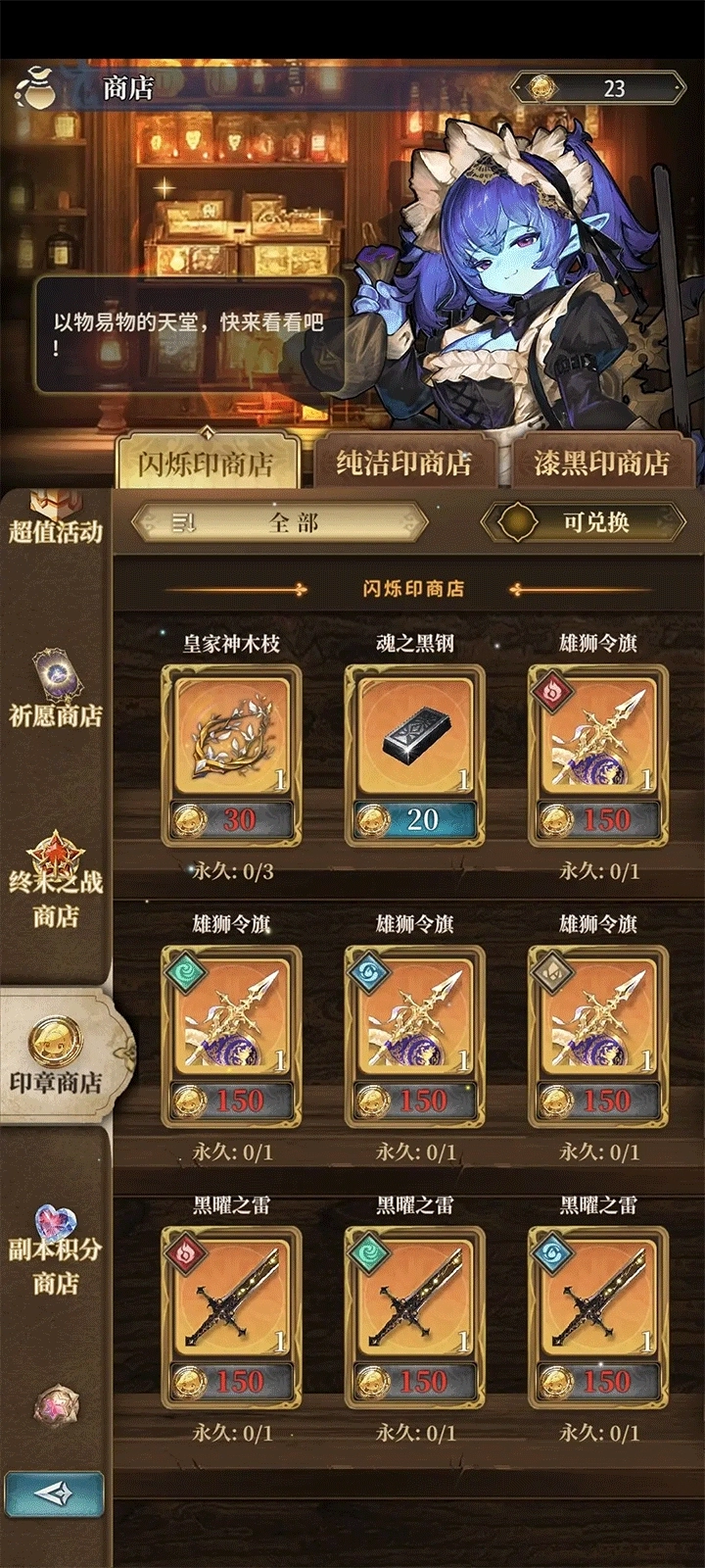 前面我们说到,抽取武器获得的重复素材会转化为不同稀有度的印章,而这些印章就能够在这里换取一部分道具。
