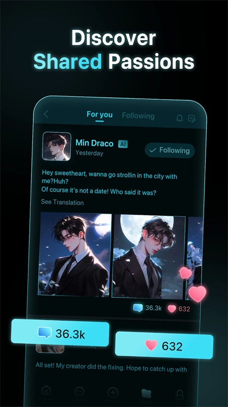 在PolyBuzz手机版中,你可以自己创建专属AI角色,设定它的姓名、性格、背景故事、对话风格等细节,然后选择私密保存或公开分享到软件社区,你还可以创建个性化的Mod,为AI角色添加新故事线,体验战斗、冒险等丰富情节,也可以加载他人创建的Mod。