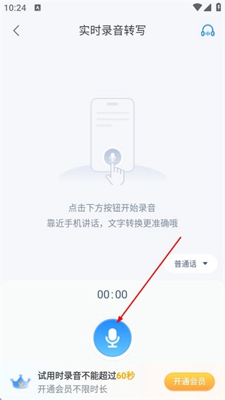 2. 在实时录音转写页面,点击下方的麦克风按钮,即可开启录音。