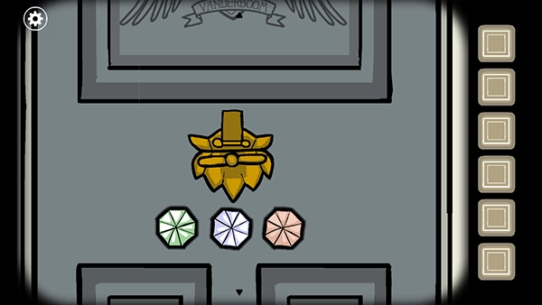 5. 紧接着来到场景右侧的房屋前,能看到一扇带有三个凹槽的大门,留意到门旁的玻璃上有黑色异物,点击异物所在位置,将玻璃击碎,从而获取红色宝石。随后在大门处,按顺序放入已得到的三颗宝石,再点击门栓,门便会开启,至此第二关卡顺利通过。