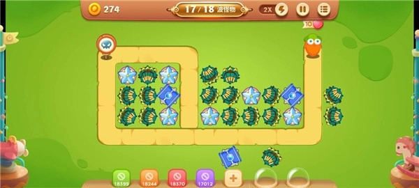 保护糖果车不被怪物吃掉,获得的糖果车越多,糖果车加分也越高。对糖果车来说,最讨厌的就是飞行怪啦!飞行怪的速度快,可以很快追上糖果车。不过,飞行怪的血量比起其他怪物来说还是比较低的,所以我们要安置减速炮塔,减缓飞行怪的速度,让其它炮塔有更多的攻击时间,尽快把飞行怪打掉。